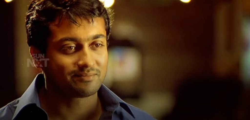 தொழிலதிபர் வேடத்தில் சூர்யா அமீரை விட மிகச்சிறப்பாகப் பொருந்தியிருந்தார் என்று நினைக்கிறேன். சூர்யா அந்த கதாபாத்திரத்தில் அத்துணைக் கச்சிதமாக இருந்தார். சத்யனிடம் எப்படி நிற்க வேண்டும், எப்படி நடக்க வேண்டும், எப்படி பேச்சைத் துவங்க வேண்டும் என ஒரு மேல் தட்டு மனிதனின் நடை உடை பாவனையை அப்படியே கண் முன் கொண்டு வந்து நிறுத்தியிருப்பார். மேலும் அசினுடன் மிகச்சிறப்பாகப் பொருந்திப்போயிருப்பார்.