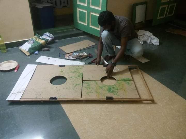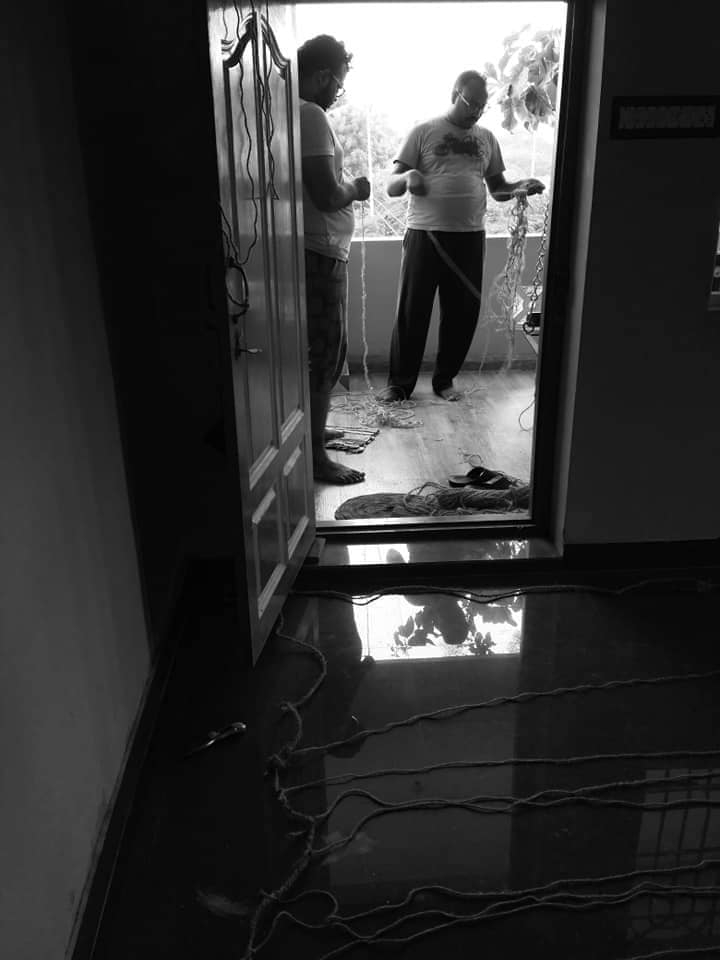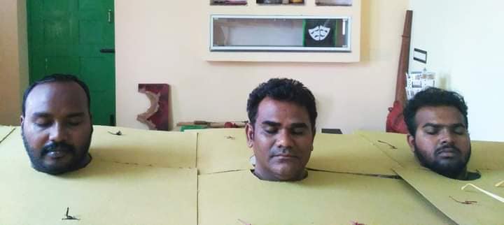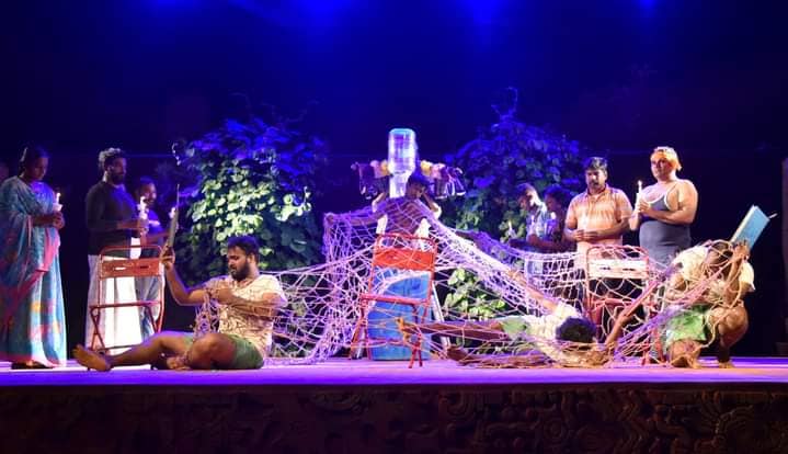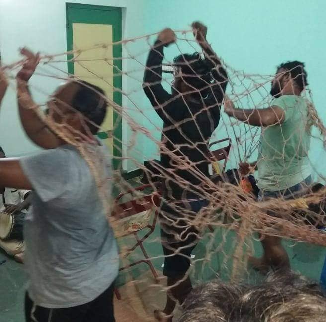 நாடகத்திற்குத் தேவையான property குறித்து பேசத் தொடங்கினோம். கூண்டு ஒன்று தயார் செய்ய வேண்டி இருந்தது. அதை தனுஷ் அண்ணன் அவர்கள் தயார் செய்தார். முதலில் கூண்டில் வெட்டப்பட்டு இருந்தது மூன்று தலைகள் அப்படியாகத் தான் இருந்தது. பின்பு இரண்டு என்று ஆனது. அக்கூண்டு பல பரிமாணங்களைப் பெற்று தற்போது உள்ள நிலையை அடைந்து இருக்கிறது. சீட்டுக்கட்டை வைத்து சாட்டை ஒன்றை தயார் செய்தோம். இது போல நிறைய பொருள்கள் உருவாகத் தொடங்கின. முக்கியமாக வலையைக் குறிப்பிட வேண்டும். இரண்டு நாட்களாகத் தயார் செய்தோம். அதன் ஒவ்வொரு பின்னலிலும் ஒவ்வொரு கதை அடங்கி இருக்கிறது. அத்துணை விஷயங்களைப் பகிர்ந்து கொண்டேதான் பணி செய்தோம்.