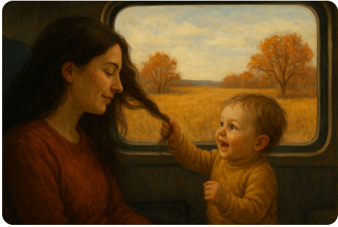 മുൻവശത്തെ സീറ്റിൽ അമ്മയുടെ മടിയിൽ കയറി നിൽക്കുന്ന മൂന്നോ നാലോ വയസുള്ള കുട്ടി വണ്ടിയുടെ ചെറിയ ഇളക്കത്തിനൊപ്പം ചാടി കളിക്കുകയാണ്. താഴെ വീഴാതിരിക്കാൻ അമ്മയുടെ മുടിയിൽ മുറുകെ പിടിച്ചിട്ടുണ്ട്. വേദനക്കിടയിലും പുഞ്ചിരിച്ചു കൊണ്ട് അമ്മ അത് പ്രോത്സാഹിപ്പിക്കുന്നുമുണ്ട്.