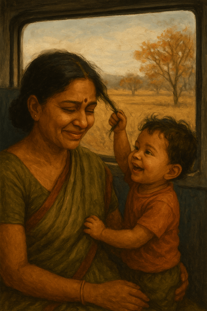 முன் இருக்கையில் அம்மா மடியில் நின்றுகொண்டிருந்த மூன்றோ நான்கோ வயதுடைய குழந்தை, இரயிலின் சிறிய அசைவிற்கேற்ப துள்ளிக் குதித்து சிரித்துக்கொண்டிருந்தது. அந்தக் குழந்தை, தான் விழாமல் இருக்க அம்மாவின் தலைமுடியைப் பிடித்துக் கொண்டிருந்தது. வலி இருந்தபோதிலும் அம்மா புன்னகையுடன் அதனை ஊக்குவித்துக் கொண்டிருந்தார்.
