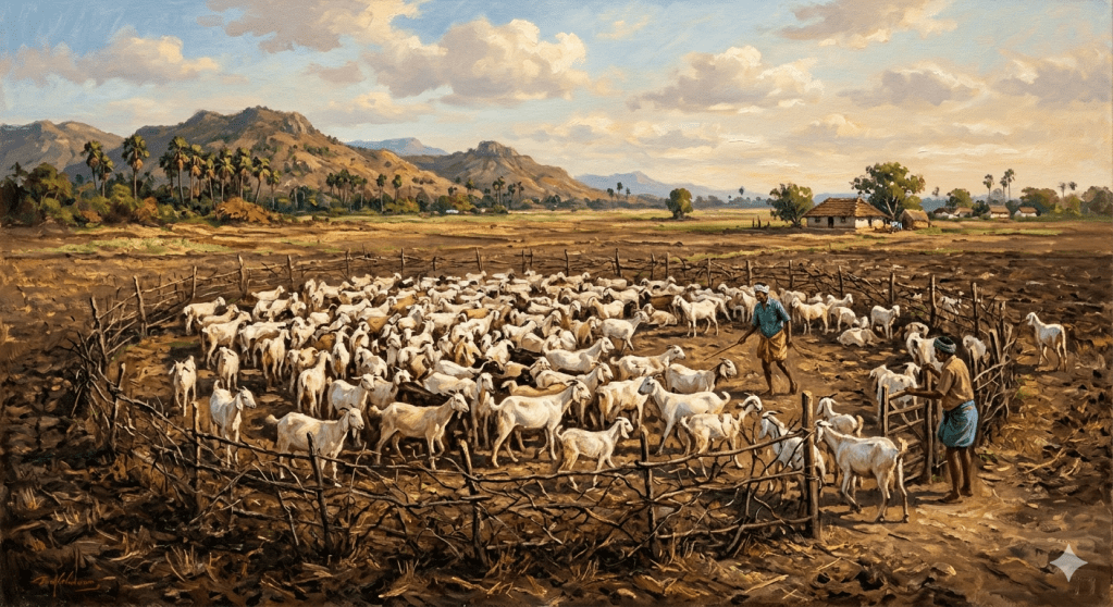 தங்கள் சொந்த ஊரை விட்டு விட்டு நாடோடி வாழ்க்கையை மேற்கொண்டு, செல்லும் இடத்தில் கிடையமைத்து தங்களுக்குத் தெரிந்த மேய்ச்சல் தொழிலையும், ஆடு போடும் புழுக்கையையும் நம்பித்தான் வாழ்க்கையை வாழ்கிறார்கள் என்று அவர்களின் அவல நிலையை கதை போகும் போக்கில் காட்சிப்படுத்துகிறார். தான் பசியோடு இருந்தாலும் தாங்கள் வளர்க்கும் ஆட்டுக்குட்டிகள் பசியோடு இருக்கக் கூடாது என்ற நல்ல மனநிலையும், மனநலம் பாதிக்கப்பட்ட பெண்ணிற்கு பிரசவம் பார்த்து, பிறந்த இரண்டு பெண் பிள்ளைகளையும் யாரும் வளர்க்க முன்வராத நிலையில் தாமே வளர்ப்போம் என்று வளர்க்கும் கணவன் மனைவியின் கருணை உள்ளத்தையும் காட்டுகிறார் நாவலாசிரியர்.