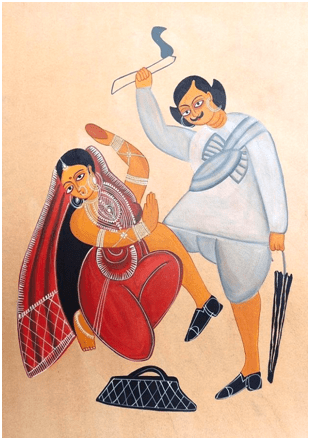 19 ஆம் நூற்றாண்டின் மத்தியில், பிரிட்டிஷ் ஆட்சியின் கீழ் கொல்கத்தா ஒரு புதிய நகர நாகரிகத்தை உருவாக்கியது.புதிய பணக்கார வர்க்கம், “பாபுக்கள்” என்று அழைக்கப்பட்டனர். இவர்கள் மேற்கத்தியக் கலாச்சாரத்தால் ஈர்க்கப்பட்டு, ஆடம்பரமாக வாழ்ந்தனர். காளிகட் ஓவியர்கள் இந்த சமூக மாற்றங்களையும், அதன் விளைவுகளையும் தங்கள் ஓவியங்கள் மூலம் விமர்சித்தனர்.பாபுக்கள், அவர்களின் ஆடம்பரமான வாழ்க்கை முறை (விலையுயர்ந்த ஆடைகள், காலணிகள், சிகரெட்டுகள், மது அருந்துதல்), மற்றும் சமூக நடத்தை ஆகியவை கேலிச்சித்திரங்களாக (caricatures) சித்தரிக்கப்பட்டன.
