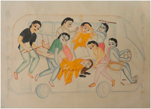 காலனித்துவ அதிகாரிகள், நிலப்பிரபுக்கள் ஆகியோரின் அதிகார துஷ்ப்ரயோகச் செயல்கள், சமூகத்தில் நிலவிய ஊழல்கள், நீதித்துறைச் சீர்கேடுகள், சமூகக் கொடுமைகள் ஆகியவை ஓவியங்கள் மூலம் விமர்சிக்கப்பட்டன. உதாரணமாக, தாரகேஸ்வர்படுகொலைபோன்ற முக்கிய சமூக நிகழ்வுகள், ஓவியங்கள் மூலம் பதிவு செய்யப்பட்டன.