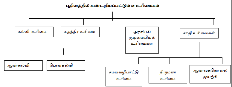 - அரசியல் மற்றும் குடிமையியல் சார்ந்த உரிமைகளிலும் ஒவ்வொரு மனிதனுக்கும் உரிமை உள்ளது. அரசாங்க வசதியை மட்டுமே நாடிப் பிழைக்கும் மக்கள் நாட்டில் பலர் உள்ளனா். அவர்களுக்கு அரசு தரப்பில் இருந்து கிடைக்கும் பொருட்கள் மற்றும் வசதிகள் தரமானதாக இருக்க வேண்டும். இல்லையேல் அதை எதிர்த்து கேள்வி கேட்கும் உரிமை மக்களுக்கு உள்ளது.